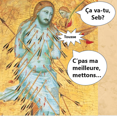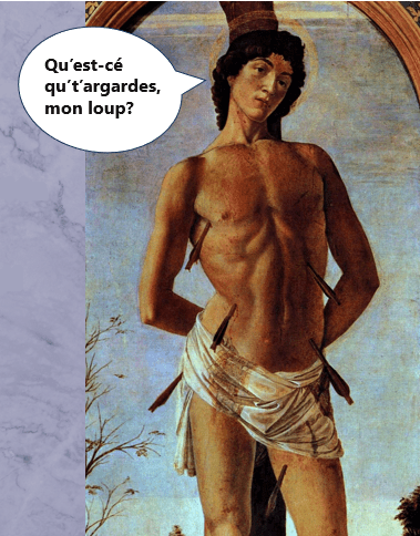 Pis comme saint Sébastien est tout percé de flèches comme un portipi, mais y meurt pas, ça veut dire qu’y résiste à la peste pis qu’y prend su lui la souffrance du monde ordinaire. TADAM!