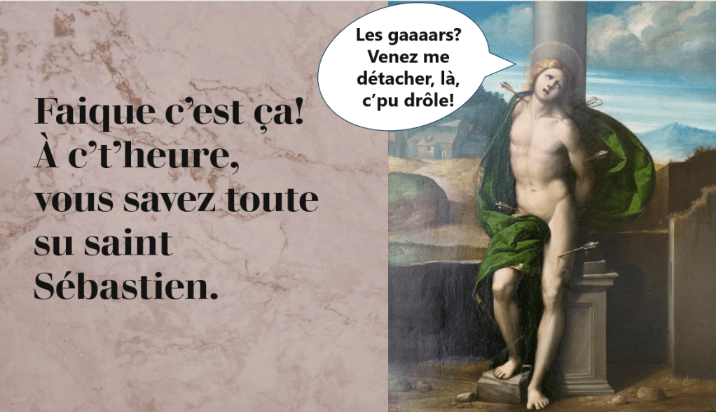–Heille, j’ai entendu une madame en confession tantôt, pis euh… Tsé, l’retable, là? Ben, a disait qu’en priant à saint Sébastien, a pouvait pas s’empêcher d’avoir des pensées impures! –Hein? Moé’ssi, y’a une madame qui m’a dit ça! À l’trouvait trop beau pis trop vrai…