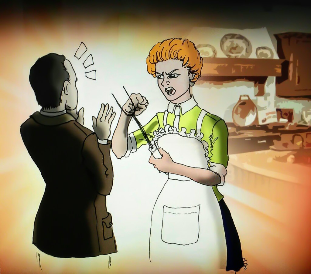 « Ah, non, pas encore toé, tabarnak! Veux-tu ben me crisser la paix avec la fièvre typhoïde? Y’avait pas plus de malades dins places où j’ai travaillé qu’ailleurs; y’en a partout, de c’te maladie-là! Pis je l’ai jamais pognée d’ma vie! À part de ça, m’avez-vous vue? J’ai tu l’air malade? Hein? J’ai tu l’air malade? Ben non, astie, ch’t’en pleine forme! Je laisserai personne m’accuser d’affaires de même! Pis toé, mon astie de sans dessein, t’es aussi ben de pu jamais te pointer la face icitte! »