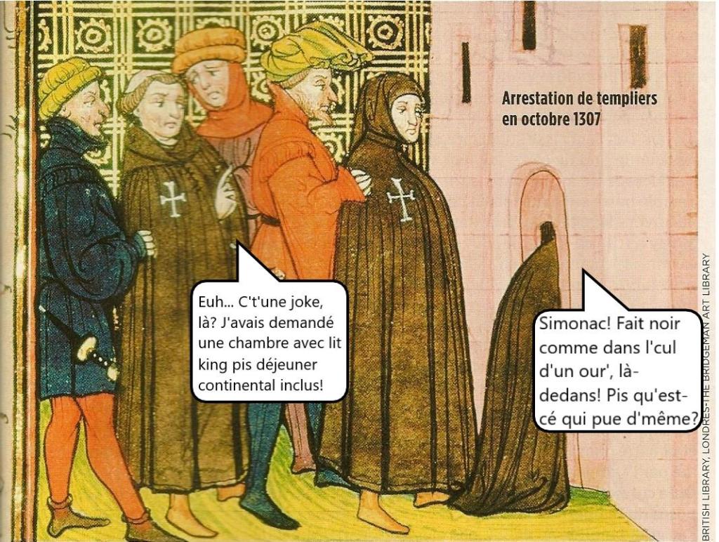 Sauf que l’pape, qui avait pas pantoute envie de faire ça, se traîna un ti peu les pieds, faique Philippe le Bel se tanna : y’organisa, dans le plus grand secret, l’arrestation de l’Ordre au complet en France. Pis comme les Templiers étaient pas des bandits, y se laissèrent emmener comme des agneaux.