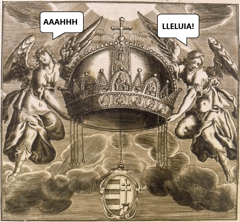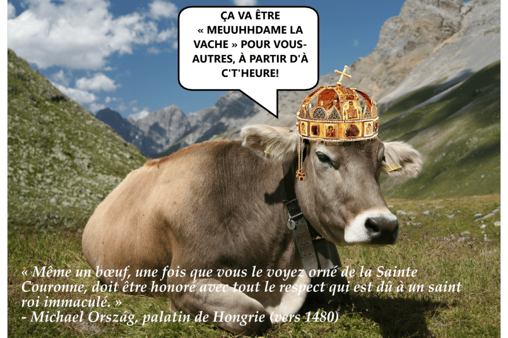 Mais en Hongrie, c’tait pas d’même que ça marchait pantoute. Pour devenir roi, ça te PRENAIT la Sainte Couronne. Cette couronne-LÀ. Parce que le laser de pouvoir divin, au lieu de passer par la viande du souverain, y passait par la couronne. C’tait la couronne elle-même qui avait l’autorité pour régner, qui avait toute les pouvoirs, qui était propriétaire des terres du royaume, pis qui faisait le lien entre les cieux des anges pis l’plancher des vaches.