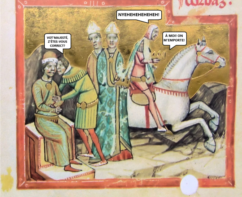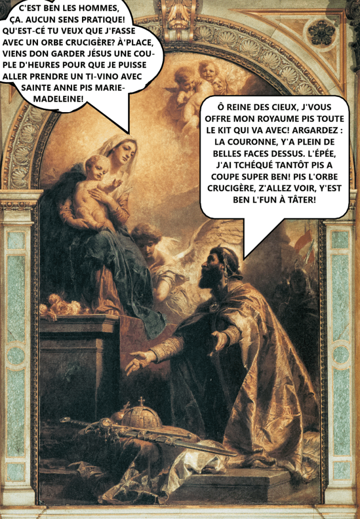 Là, vous vous dites, « ouais mais ça marche pas, Matante Poêle, t’avais dit que fallait absolument avoir la couronne pour être un vrai roi ». Mais en 1270, c’tait pas encore tout à faite commencé, c’t’affaire-là. Par exemple, en 1078, le roi Ladislas Ier avait refusé de s’mettre une couronne su’a tête, parce qu’y « préférait une couronne divine plutôt qu’une couronne terrestre de roi mortel ». Tu parles d’un péteux.