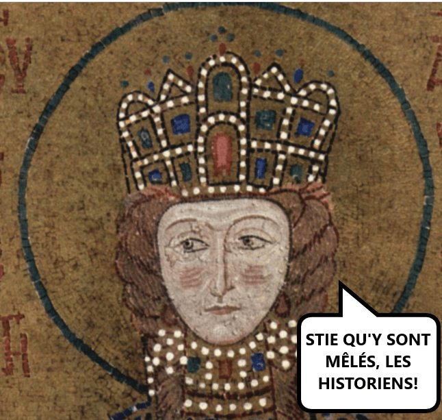 Pis à part de t’ça, ça s’rait une couronne de femme! Argardez icitte. Ça, c’est un portrait de l’impératrice byzantine Irène, qui s’adonnait justement à être une princesse hongroise :