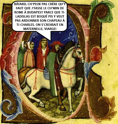 Y’essaya d’abord d’être gentil (badoum tish), mais c’est yinque quand y menaça Ladislas de l’excommunier que la Sainte Couronne s’artrouva enfin su’a tête à Charles-Robert.