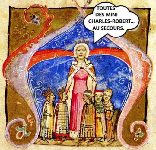 Avec ça, la nouvelle dynastie des Anjou était ben installée su’l trône après 8 ans de chicane sanglante. Charles-Robert eut un beau règne pis une descendance nombreuse. Tchéquez ça : elle, c’est sa femme Élizabeth de Pologne pis ses trois gars pis deux filles.