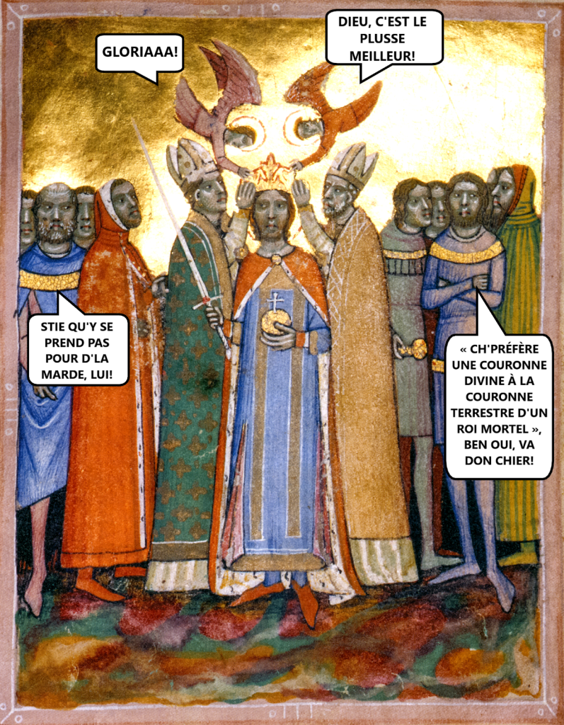 Normalement, comment ça marche, c’est que Dieu tire son laser d’autorité divine drette su le roi ou la reine, pis c’est lui ou elle, en tant que parsonne faite en viande, qui fait le relais entre le Seigneur pis les sujets du royaume. Le couronnement, c’est yinque une signature de contrat : pas besoin d’une couronne en particulier pour que ça marche – les rois de France, eux autres, y se faisaient tout l’temps faire des nouvelles couronnes quand y s’tannaient des vieilles.