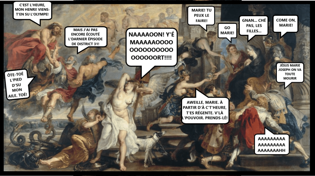 Méchante affaire, hein? À gauche, Henri s’fait emmener su l’mont Olympe par Jupiter pis Saturne comme un homme devenu dieu. Au milieu, deux Victoires nu boules s’arrachent les ch’feux. À drette, t’as Marie, la veuve à Henri, qui s’fait offrir la régence du royaume, vu que son gars Louis XIII est encore trop jeune pour régner. Est toute triste pis humble.