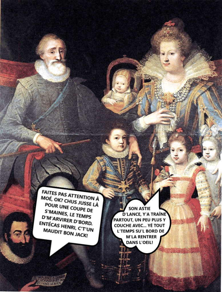 Y’ont pas eu d’enfants, pis finalement, Henri a fini par faire annuler son mariage avec Marguerite, pis y s’est armarié avec Marie de Médicis, qui lui a donné un héritier doué de zouiz quasiment tu’suite.