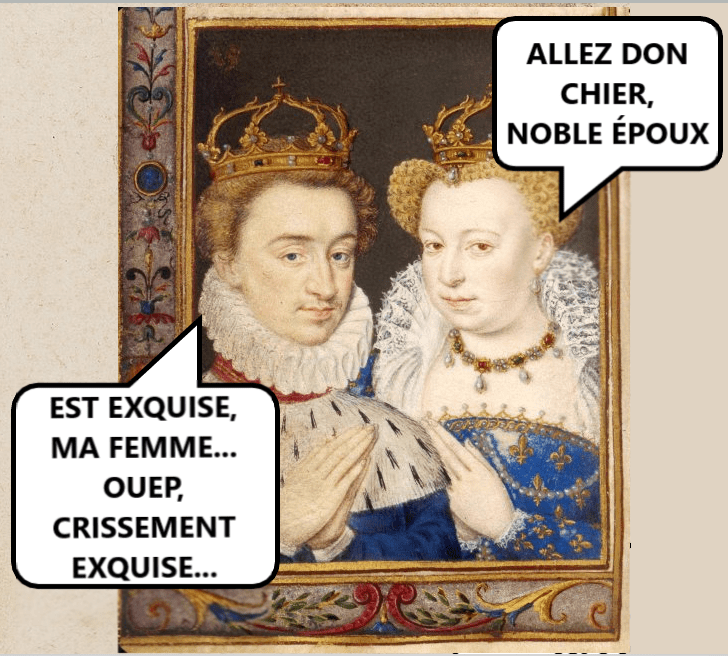 Comme on peut l’voir à leux faces qui irradient le wouptidou, y s’aimaient pas pantoute. C’tait un mariage arrangé par Catherine de Médicis, la mére à Marguerite, dans l’espoir de faire slaquer la guerre entre catholiques et protestants. Parce que, ouais, Henri était protestant; à cause de ça, y pouvait pas rentrer dans Notre-Dame, faique la cérémonie de mariage a eu lieu su’l perron d’la cathédrale.
