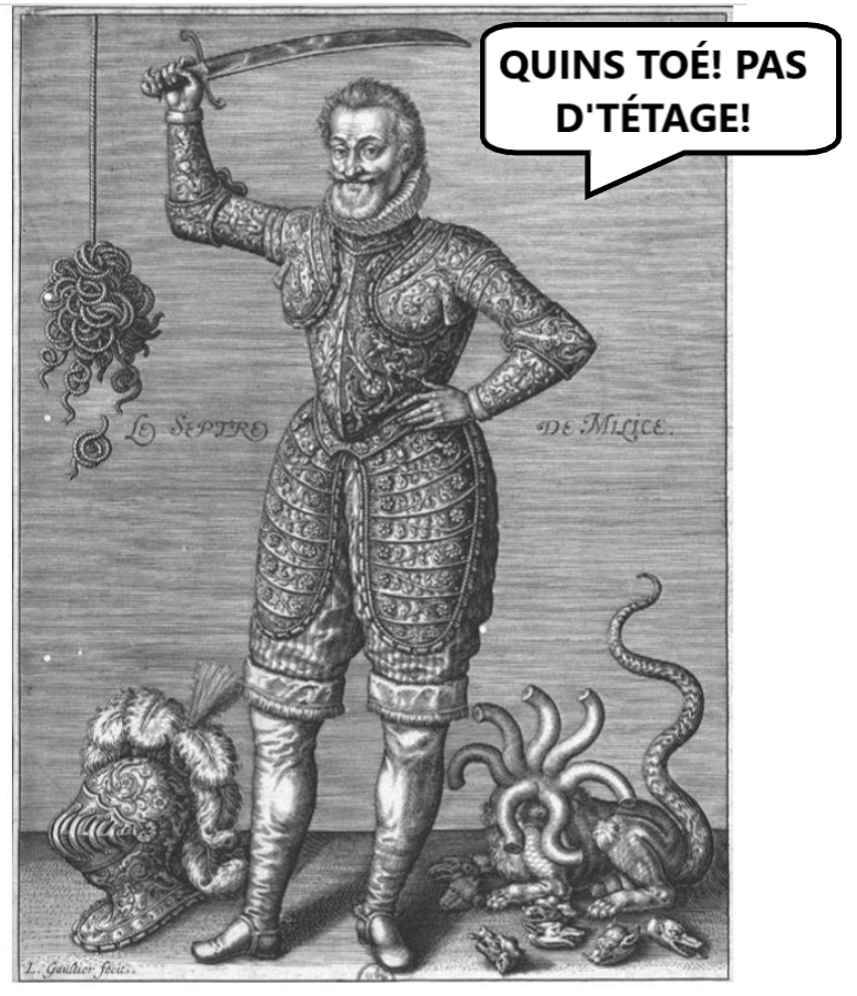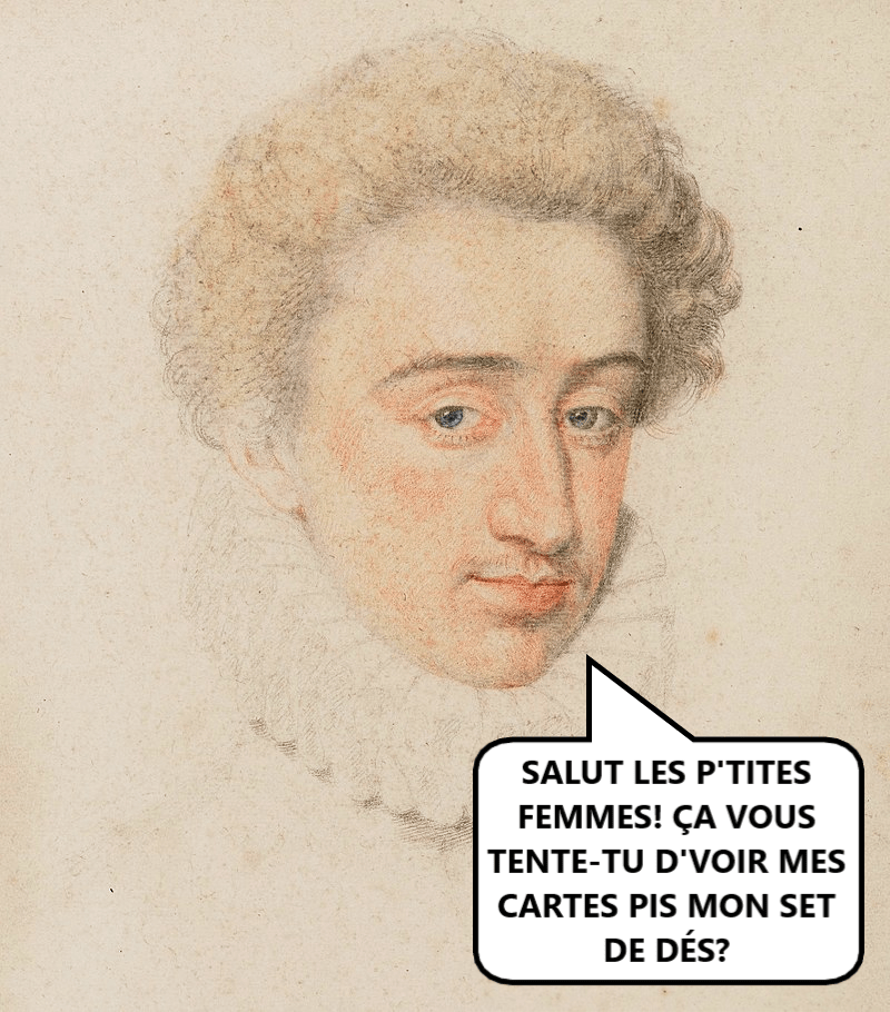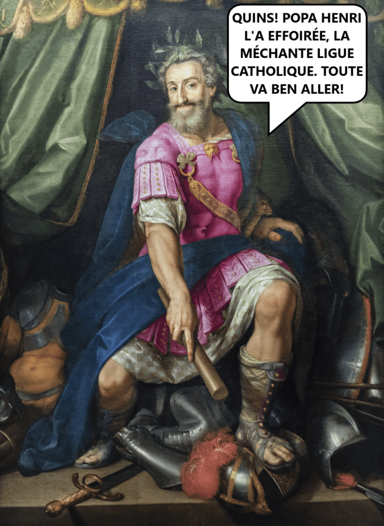 Faut dire aussi que lui, au départ, c’tait le roi de Navarre. Y’a hérité du trône de France parce que la dynastie des Valois a trouvé l’tour de passer au travers de toutes ses héritiers mâles, pis comme les Français interdisaient aux « gonzesses » d’hériter du trône, ben y’a fallu qu’y’armontent neuf générations en arrière pour se trouver un roi.