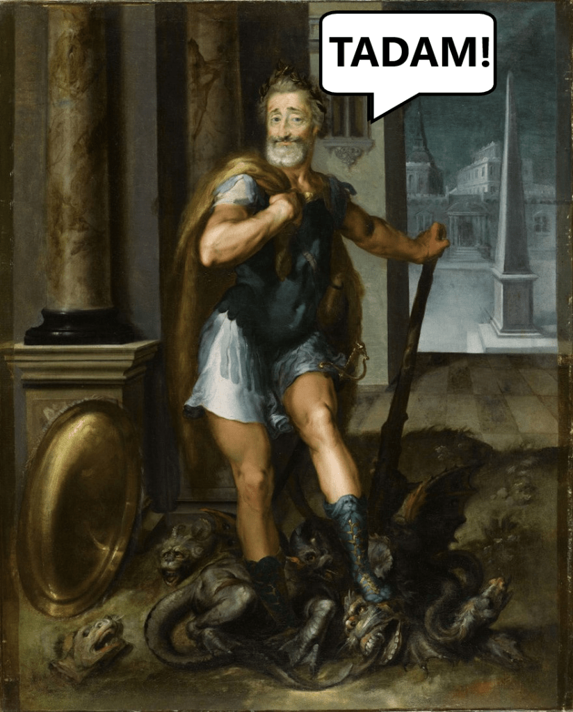 Là, on l’voit en armure, l’épée dins airs, toute drette, avec un sourire de champion. à gauche, c’est l’nœud gordien, tsé lui qu’Alexandre le Grand a fendu en deux. À drette, c’t’un mini Hydre de Lerne toute étêté, comme dins douze travaux d’Hercule. Tu’suite, on voit qu’y s’prenait pas pour d’la marde.