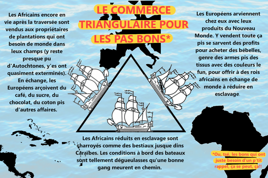 Dans c’temps-là, on était en plein commerce triangulaire. On vous a montré ça à l’école, mais ch’prendrai pas d’chance pareil :