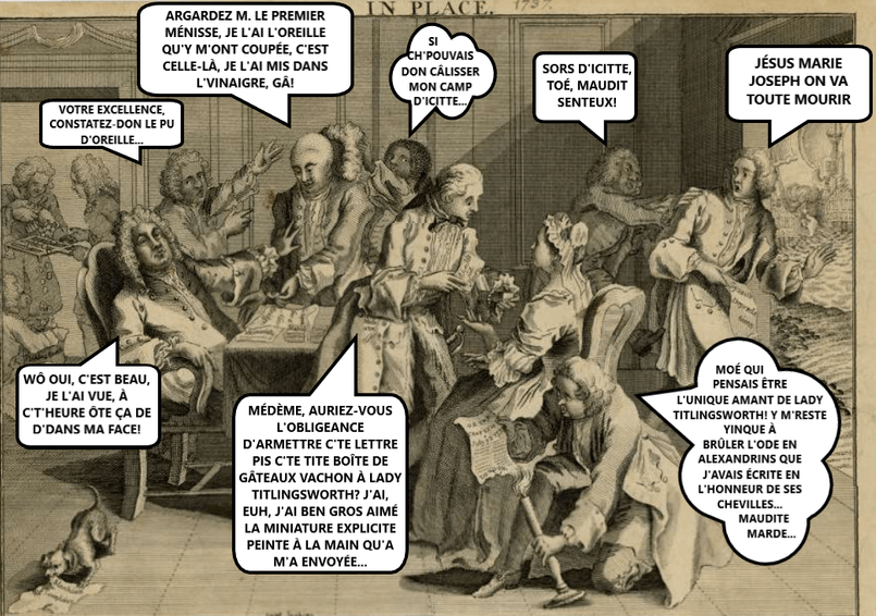 Sauf que là, l’affaire a faite pas mal plus de bruit : l’image en haut complètement, c’t’une caricature qui a paru dans l’journal The Craftsman le 24 juin 1738. Partout dans l’Empire, on parlait yinque de l’oreille à Jenkins.