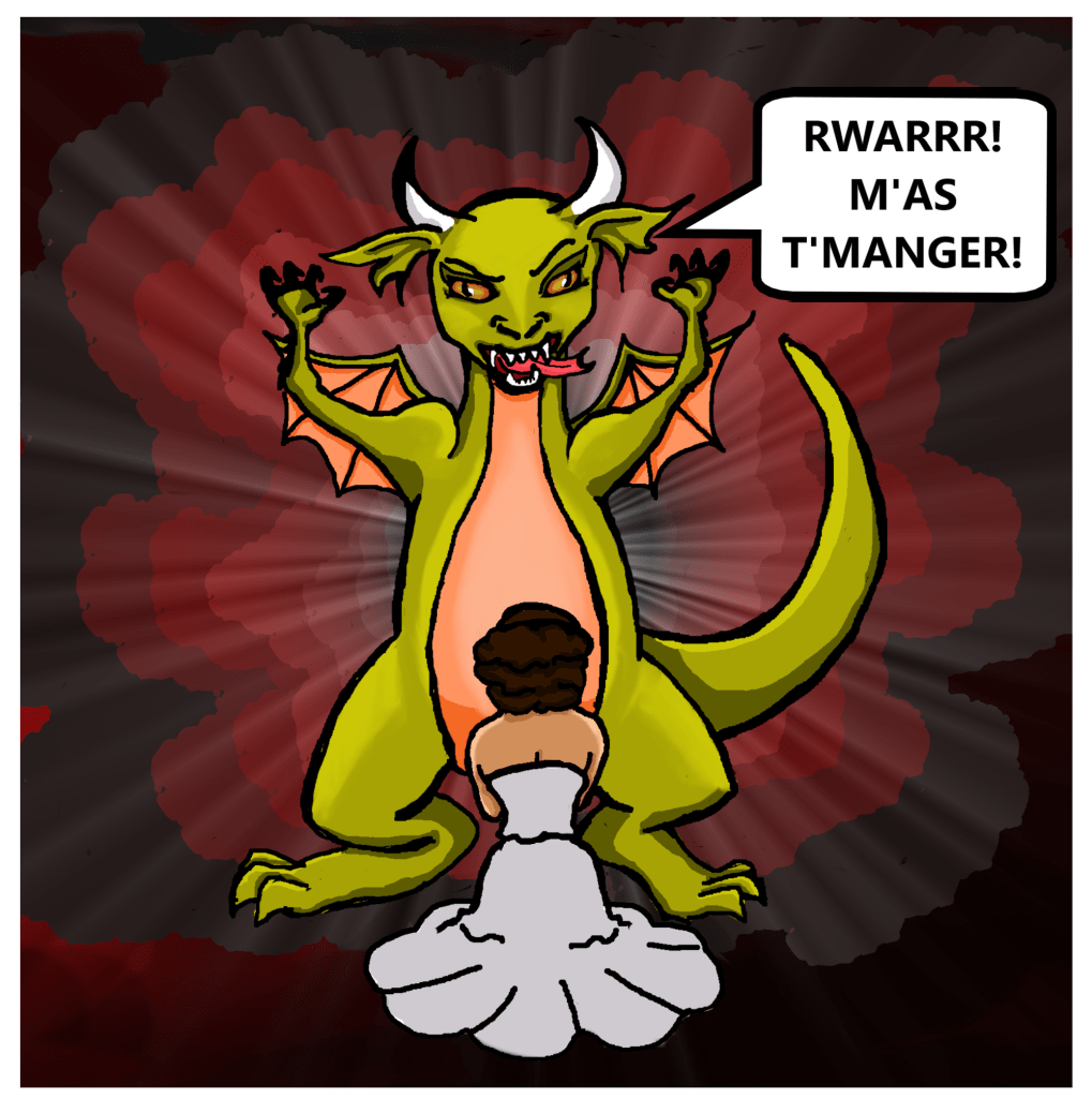 N’importe qui qui aurait eu une grosse journée d’même se s’rait couché dans l’coin pis aurait été dins vapes jusqu’au matin. Mais Marguerite en avait pas eu assez : a pria le Tout-Puissant d’y montrer l’ennemi qu’a l’avait à combattre. Pis tout d’un coup, POUF! Un dragon apparut en avant d’elle pis l’avala d’une bouchée.