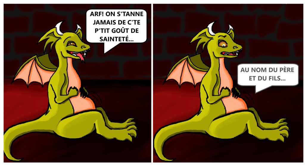 Ça aurait pu être la fin de l’histoire. Mais, dans’bedaine du dragon, Marguerite, pas encore digérée, fit le signe de la croix :