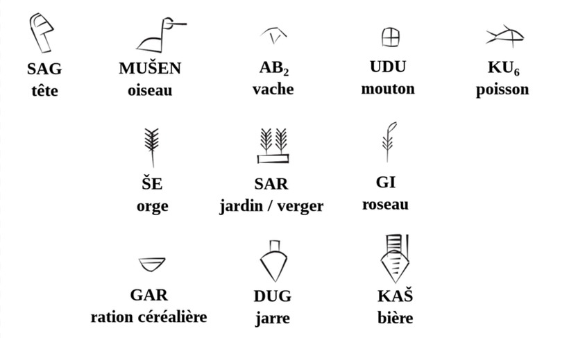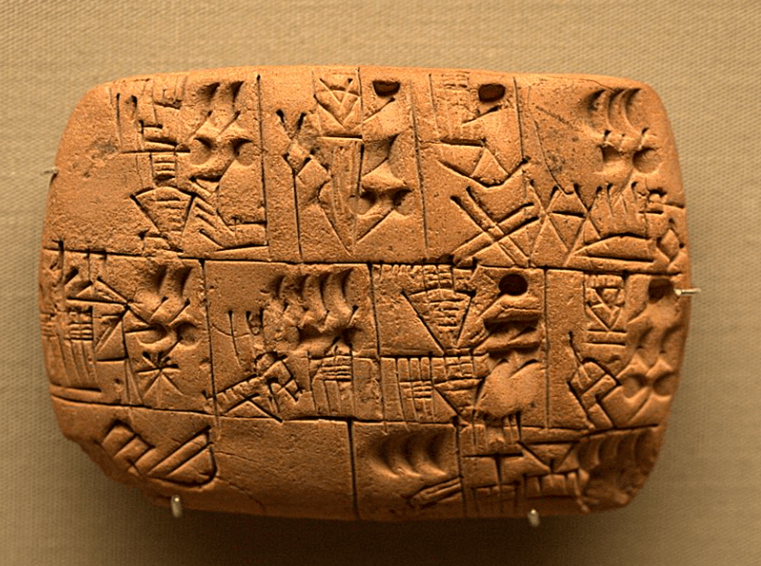 Dans c’temps-là, l’écriture se limitait à des tits dessins – des pictogrammes – su des tablettes d’argile qui servaient à’comptabilité, c’t-à-dire pour savoir combien t’avais d’sacs de grains, de moutons pis d’autres cossins. Y’avait pas vraiment de direction particulière pour graver les dessins – genre de gauche à droite comme nous autres, ou de haut en bas –, mais y’étaient organisés en colonnes. Faique, en gros, les tablettes de l’époque avaient plus de parenté avec Microsoft Excel qu’avec Microsoft Word!