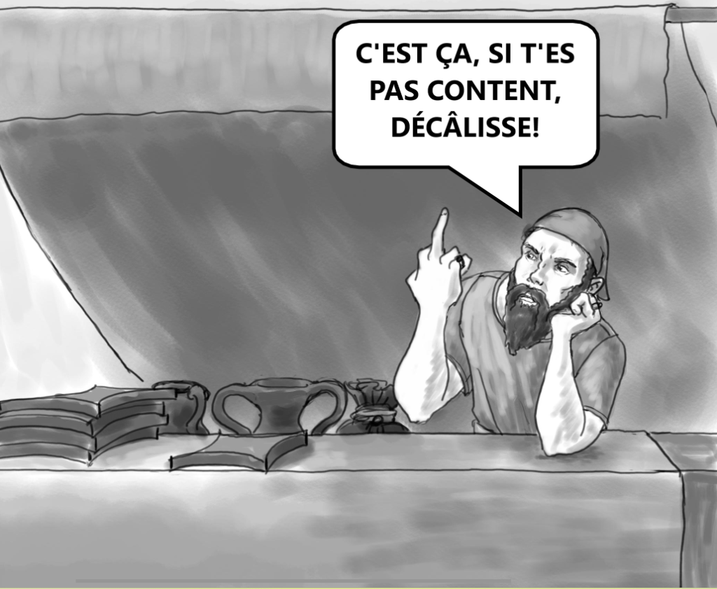 Heille, pour qui tu m’prends, chose? T’as du front tout l’tour d’la tête pour essayer d’enfirouaper un client comme moé! En plus, t’as gardé ma bourse même si mon messager a pas pris l’cuivre! J’ai envoyé du monde la chercher, mais tés as r’virés d’bord plusieurs fois! T’rends-tu compte qu’y ont dû traverser un territoire ennemi pour se rendre chez vous? Maudit cornet. De toutes les marchands qui importent du stock du royaume de Telmun, y’a yinque toé qui est baveux d’même!