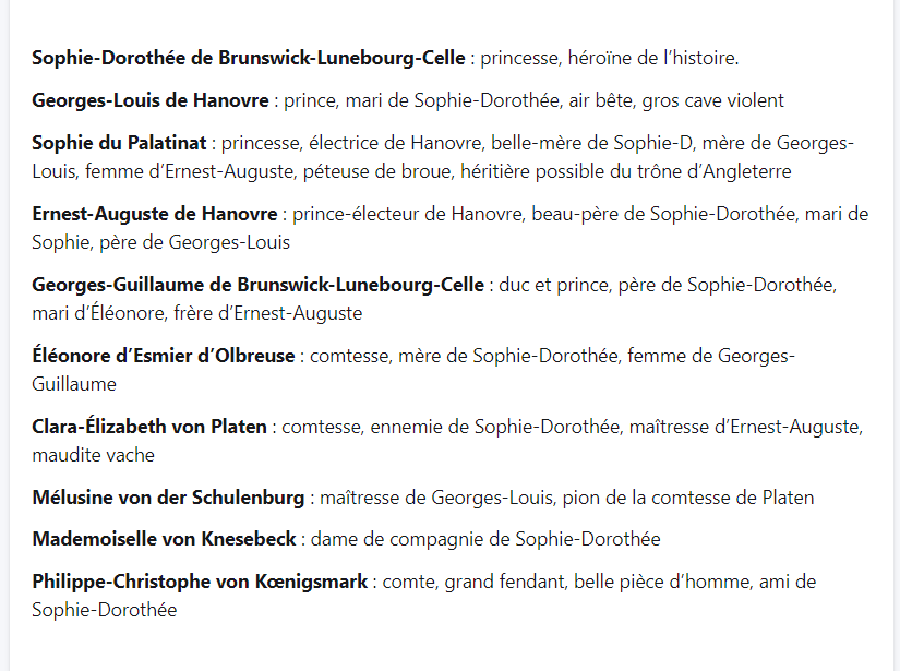 Quoi qu’y en soit, voyant qu’a l’arrivait nulle part, mais pouvant pas s’résoudre à lâcher le morceau, la comtesse proposa plutôt à Philippe la main de sa fille, Sophie-Charlotte. Kœnigsmark avait arfusé poliment, mais avait failli s’étouffer de rire en bavassant toute ça à Sophie-D :