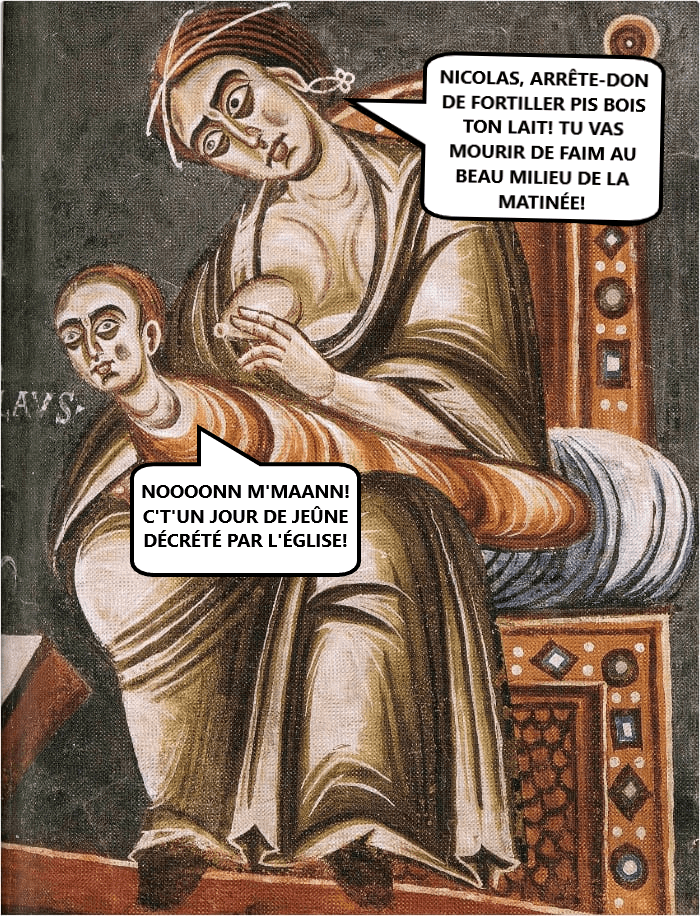 V’là une fresque du 11e siècle où on voit bébé saint Nicolas qui, selon la légende, arfusait de téter l’sein à sa mère les jours de jeûne. Encore la couche aux fesses, pis déjà plus catholique que le pape. Faut l’faire. Mais entécas, c’qui saute aux yeux, c’est que l’bebé a l’air d’un mini Nicolas Cage enroulé dans une baguette française, pis que le sein arsemble plus à une poire en caoutchouc.