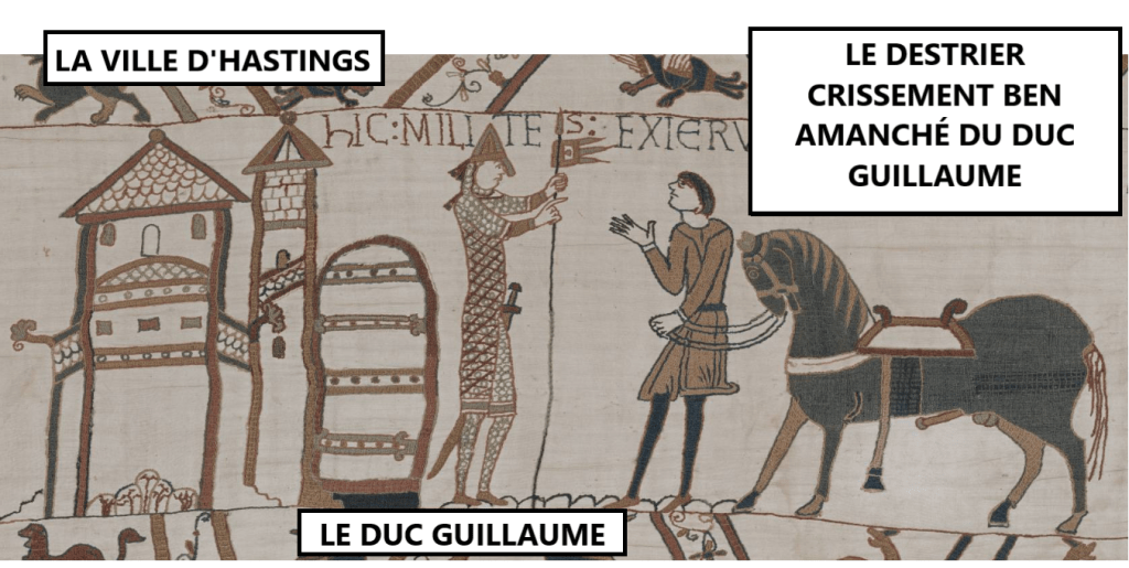 Bref, c’est plein de ch’faux shaftés, pis le plusse ben amanché d’la gang, c’est le destrier du héros d’la tapisserie, c’t-à-dire le duc Guillaume. Ça a l’air niaiseux pour nous-autres, mais à l’époque, c’tait ben utile pour le monde qui savaient pas lire, parce qu’y pouvaient tu’suite se faire une idée d’un parsonnage à partir d’la graine de son ch’fal. Pas pire, hein?