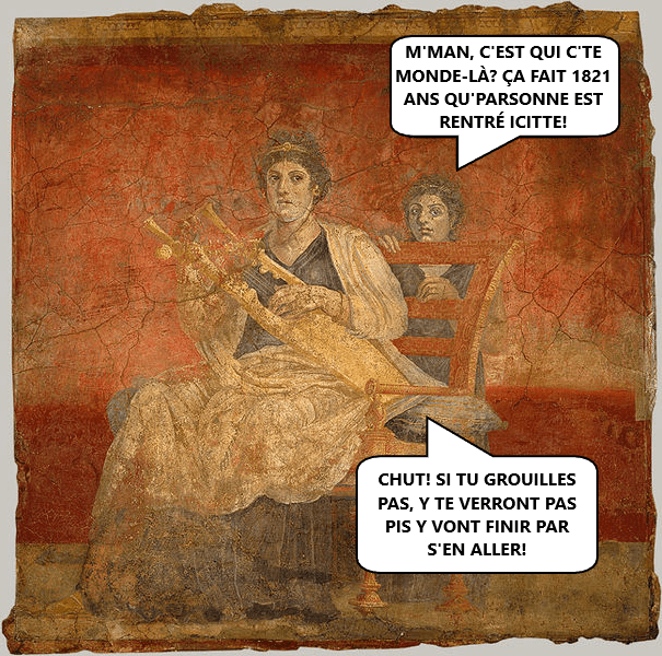Pourtant, argardez l’genre de murale qui s’faisait 1 000 ans avant, dans l’Antiquité. Celle-là était dans une maison de Pompéi qui a brûlé quand l’Vésuve a pété en l’an 79, pis a été artrouvée en 1900 :