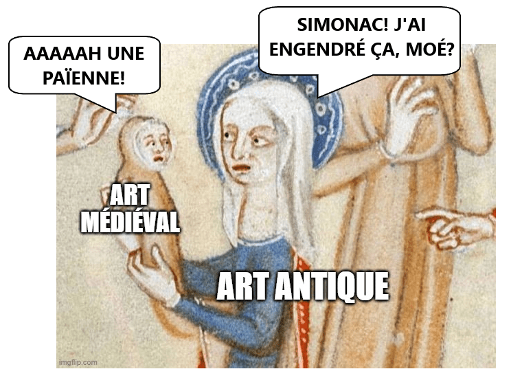 Entécas. À c’t’heure que toute ça est dit, pour finir, j’résumerais la relation entre l’art antique pis l’art médiéval avec c’t’image-là :
