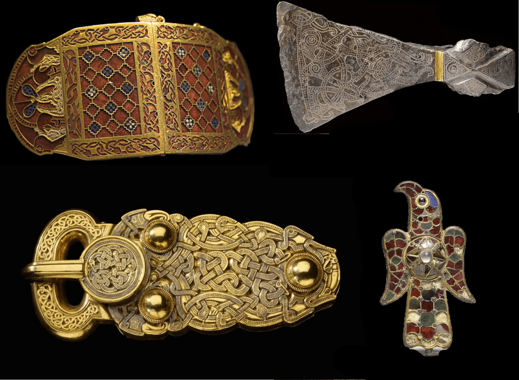 Les deux à gauche : protège épaules et boucle de ceinture du VVIe siècle, enterrement maritime anglo-saxon au Sutton Hoo. En haut à droite : hache viking trouvée dans la tombe dite de Mammen, vers 970; en bas à droite : fibule ostrogothe de style animal, Ve siècle.