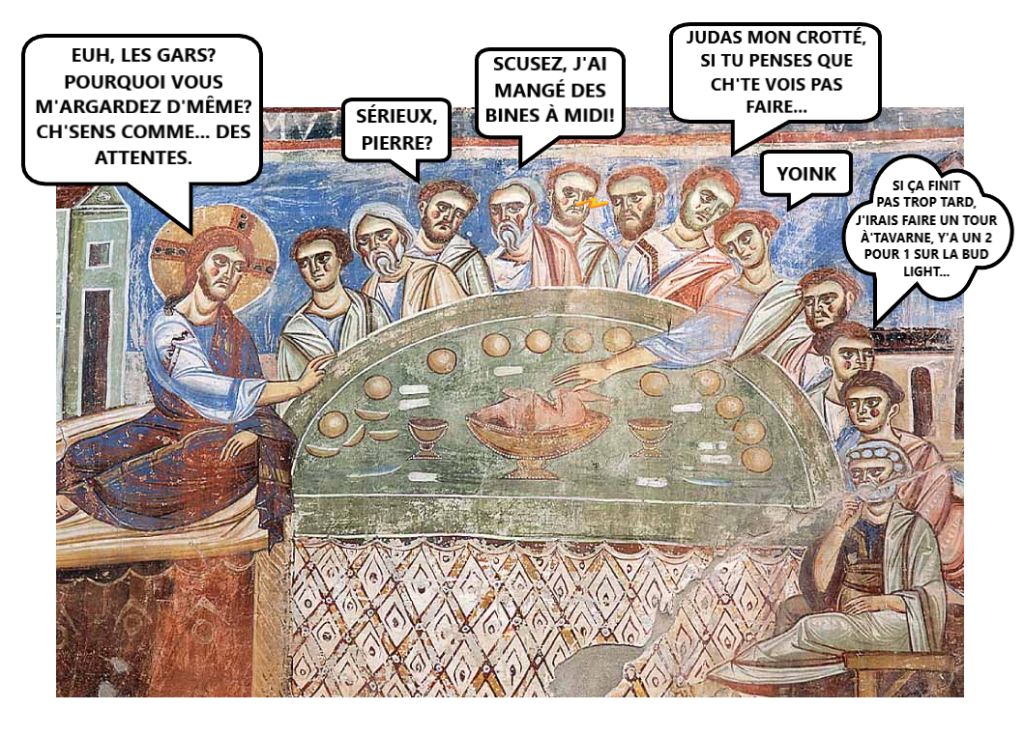 En plus, pour qui est au courant, c’est possible d’arconnaître chacun des Apôtres à partir de p’tits détails (sauf Barthélémy, Thaddée pis Jacques le Majeur – eux-autres, parsonne se rappelle jamais qu’y existent pis sont toutes pareils énéwé).
