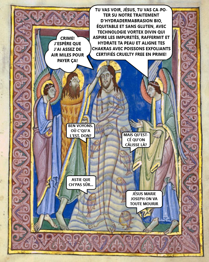 La voyez-vous, l’influence germanique? Le cadre avec des motifs qui s’répètent toute le tour, pis le dessin pas compliqué – argardez la froque de poil à saint Jean Baptiste yinque suggérée par des tis bouttes qui pendent pis les ailes hyper géométriques des anges. Pis heille, ch’peux pas PAS souligner à quel point c’est flyé, comment l’eau est arprésentée, comme une espèce de bulle avec des poissons dedans.