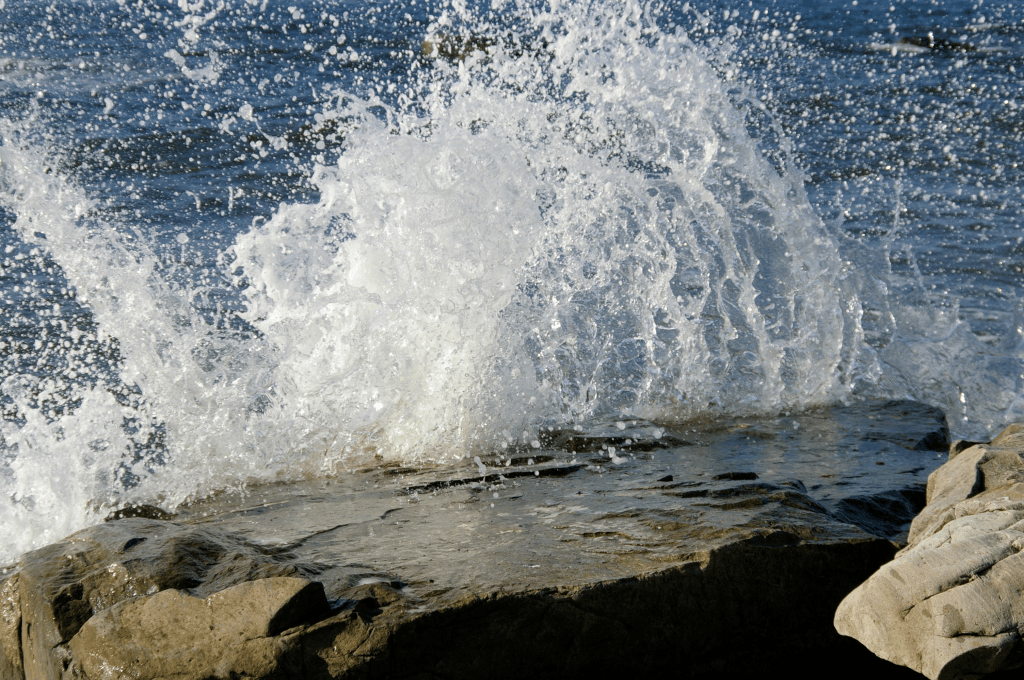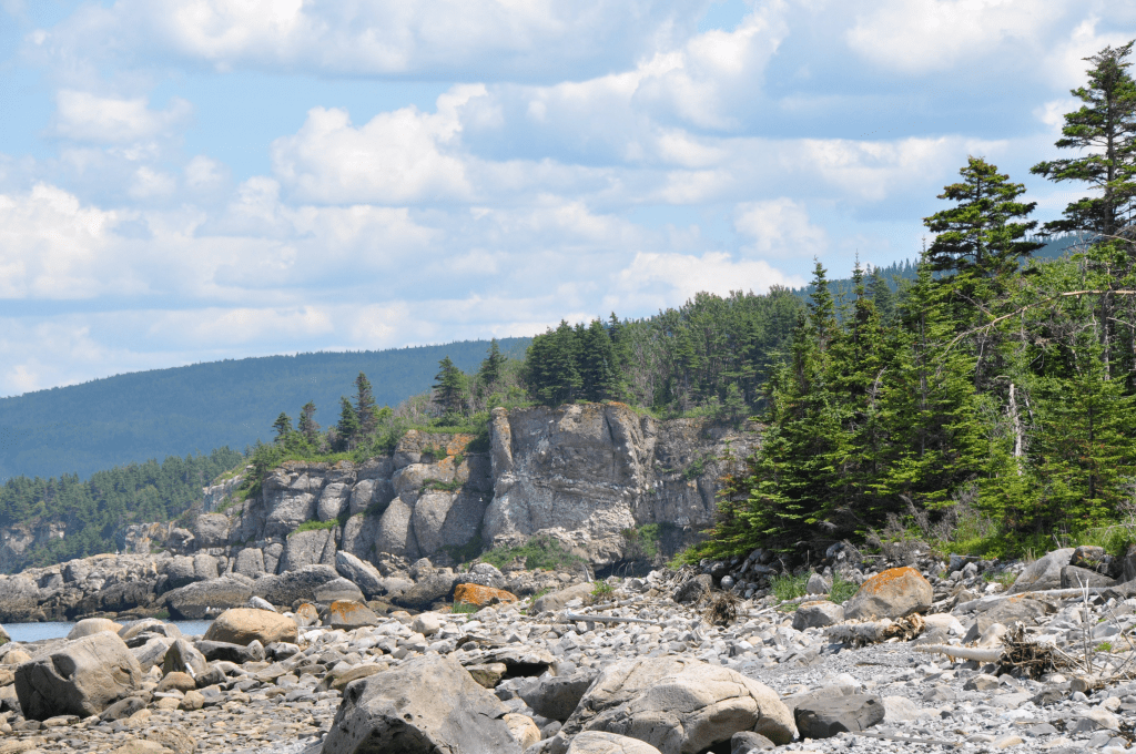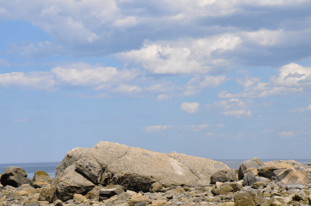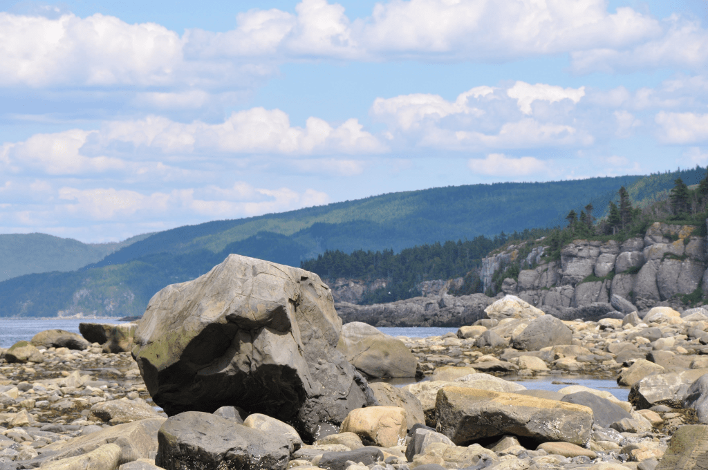 Comme j’vous disais, où on campait nous autres, y’avait pas de sable, juste d’la grosse roche ronde. Y’avait même un rocher énorme que quequ’un dins temps immémoriaux avait nommé le Gros Cran, direct en face. C’tait vraiment une sapristi d’grosse roche – j’vous dis, y’a des touristes qui se déplacent pour moins que ça.