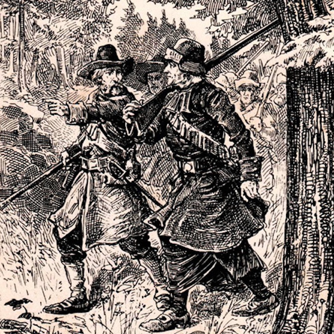 Un ti-peu rassuré mais pas tant, Jos partit pour travarser tout seul. Y’avait yinque faite la moitié qu’y surgit une GROSSE gang de Shiners armés d’bâtons – heille, pas moins de 150, selon la légende!
