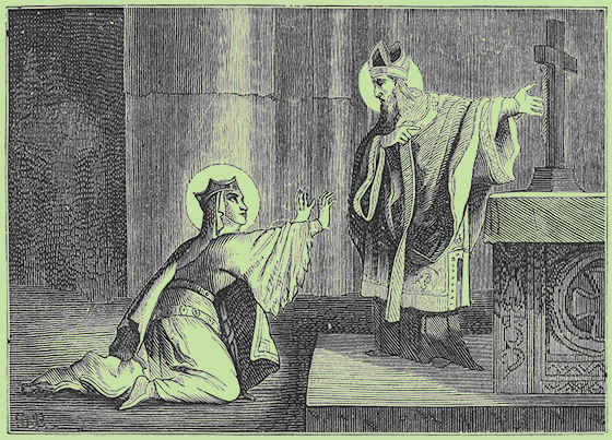 L’évêque Médard était très aimé pis y’avait la réputation d’être capable de contrôler la météo, c’qui est pratique quand tu veux pas qu’y mouille pour faire les foins! Même Clotaire pensait que c’était une bonne idée que Radegonde aille le voir pour une p’tite fin de semaine de spa spirituel. Mais elle, a l’avait une idée en arrière de la tête.